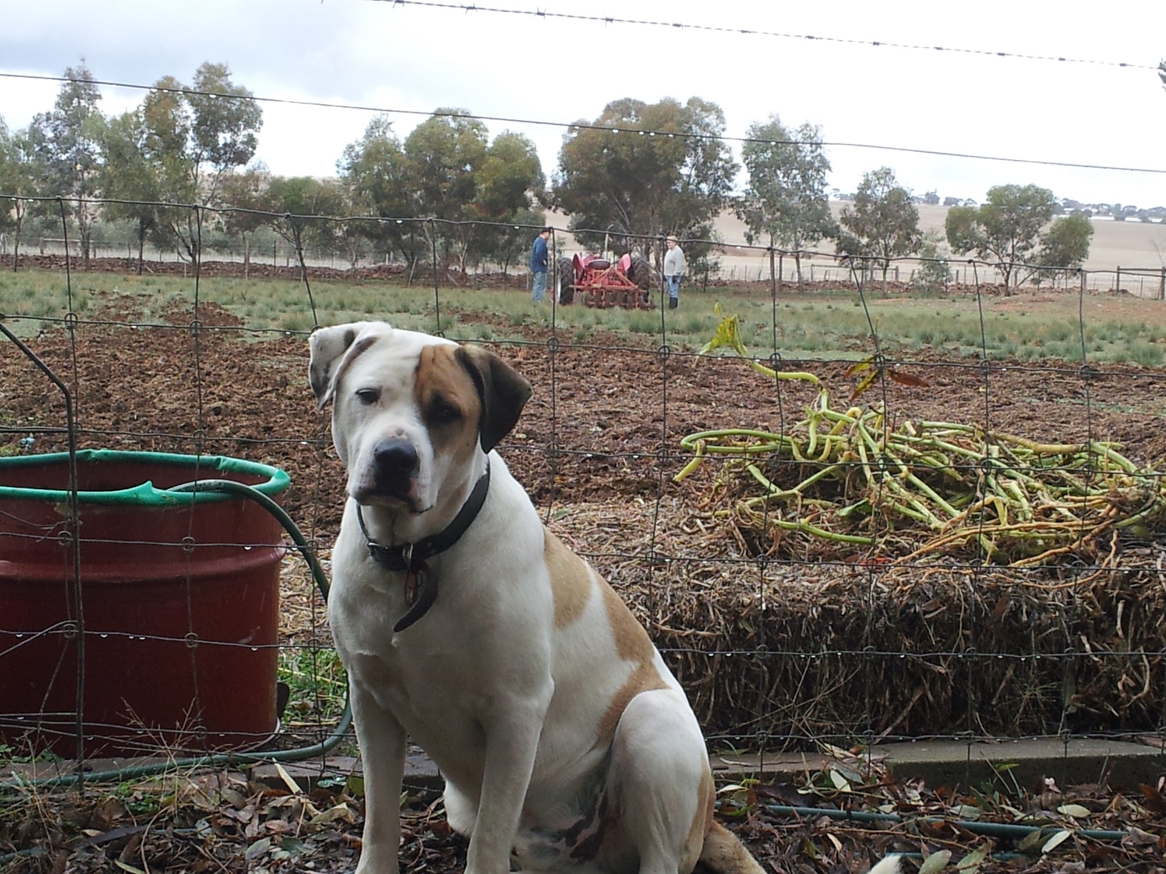 I don’t want to seem like I’m being mean to Tatyl, but I’m convinced it was her. Back when we had the first lot of meat chooks and were setting up the infrastructure for them, we had two days in a row where Bruce and Domino were accidentally left alone with 23 month-old birds. The first day the temporary fence had come down, and the second day Bruce had let himself into their yard. Both times the big dogs and the birds had spent the day together without grief. That changed with Tatyl.