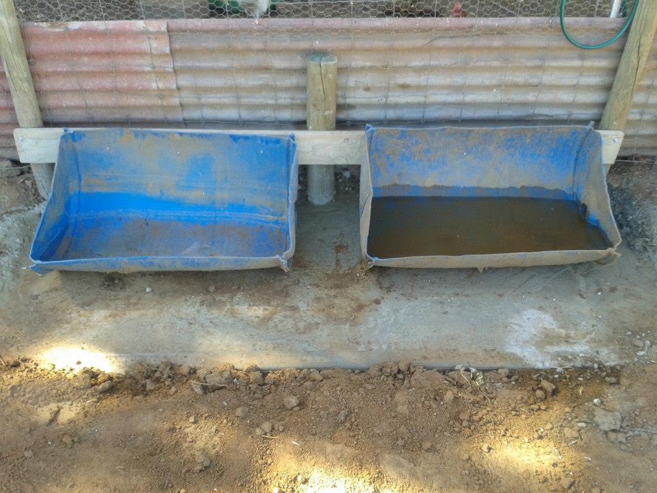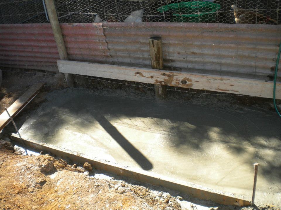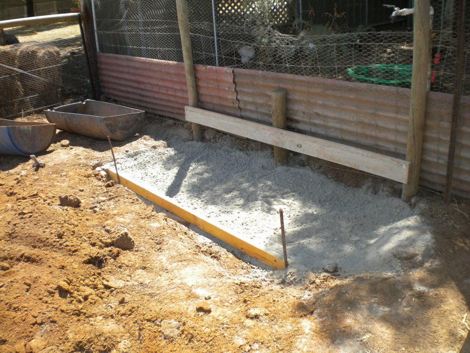 I took advantage of the good work they’d already done and widened their wallow to dimensions large enough to cement a pad under their troughs. Basically, I dug the hole out big enough and then used it as most of the shuttering for the concrete.