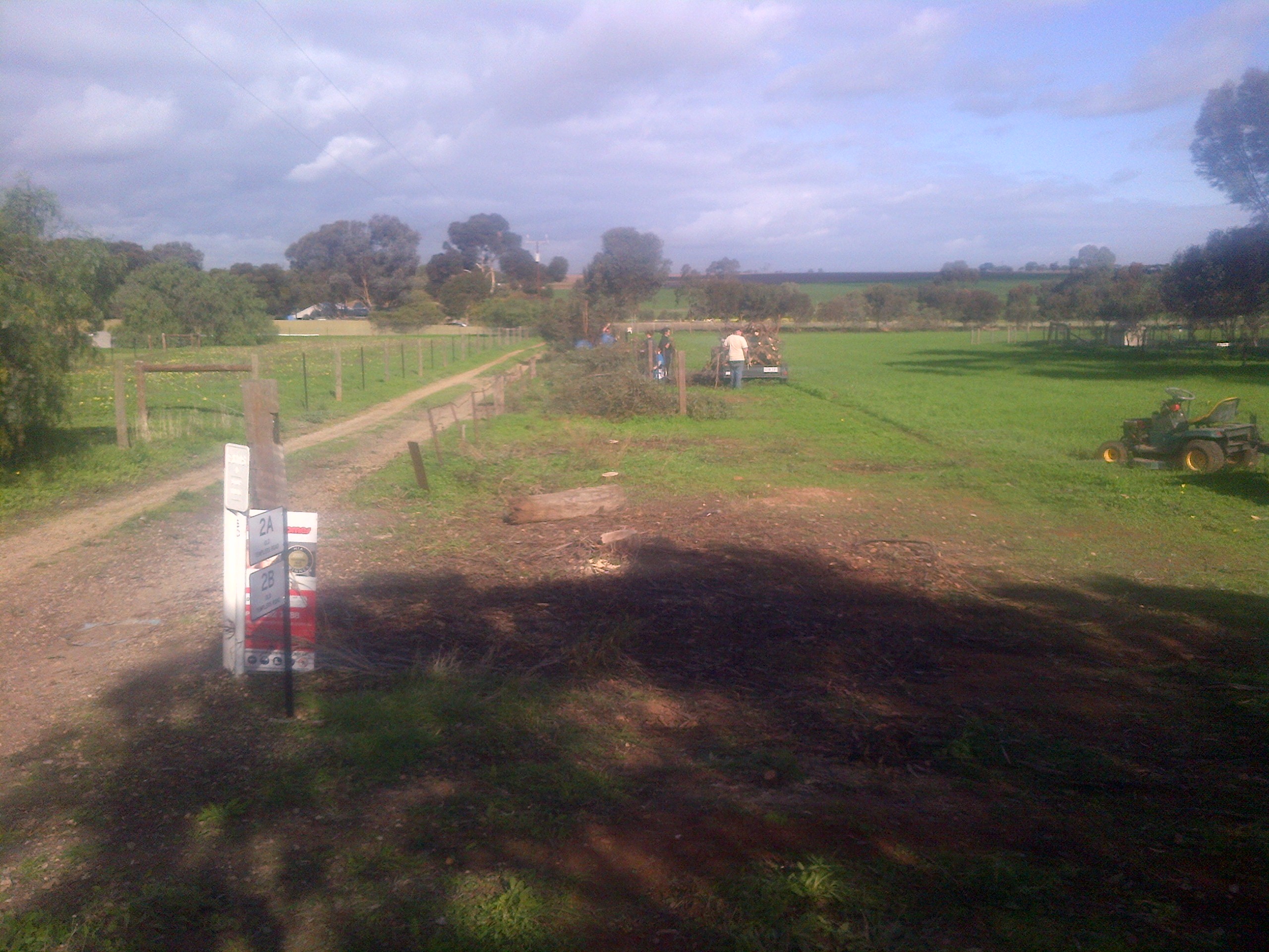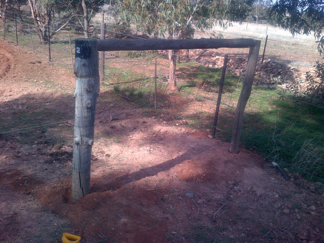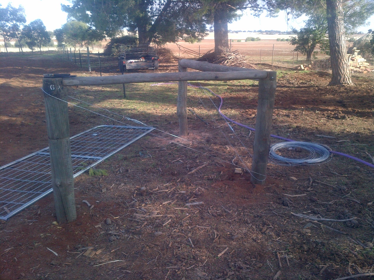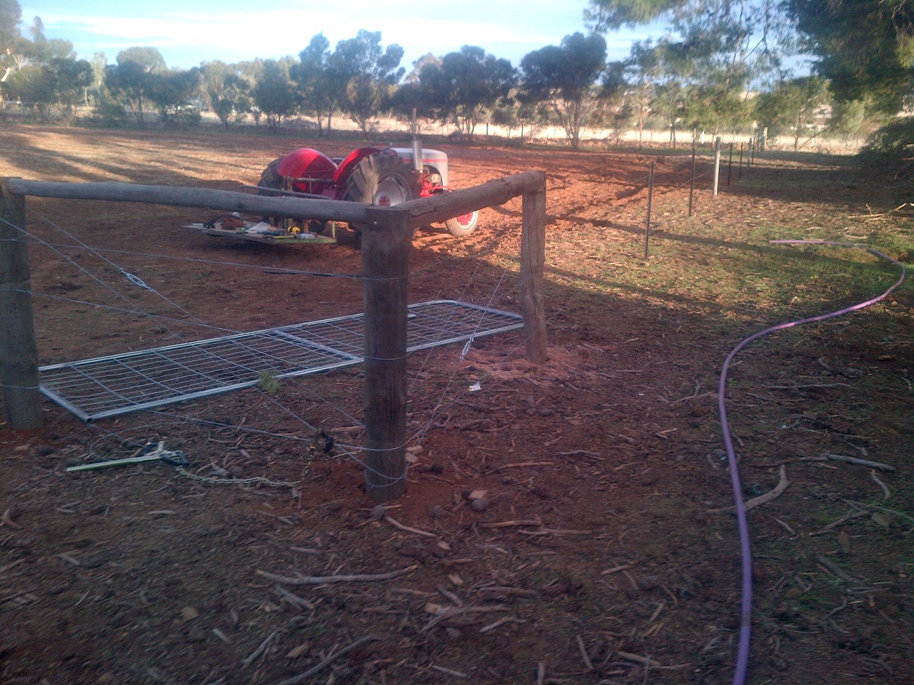 Anyway, we have a right-of-way running along our eastern border, but it was taken up almost entirely with a row of trees. There was a double fence, though the outside one had parts that were literally over 120 years old and it was unserviceable. The inside fence was relatively new, and had to come down and move a couple of feet inwards. The row of trees, which numbered a couple-of-dozen gums of maybe 10 years old and probably 5 or 6 smaller ones, also had to come down.