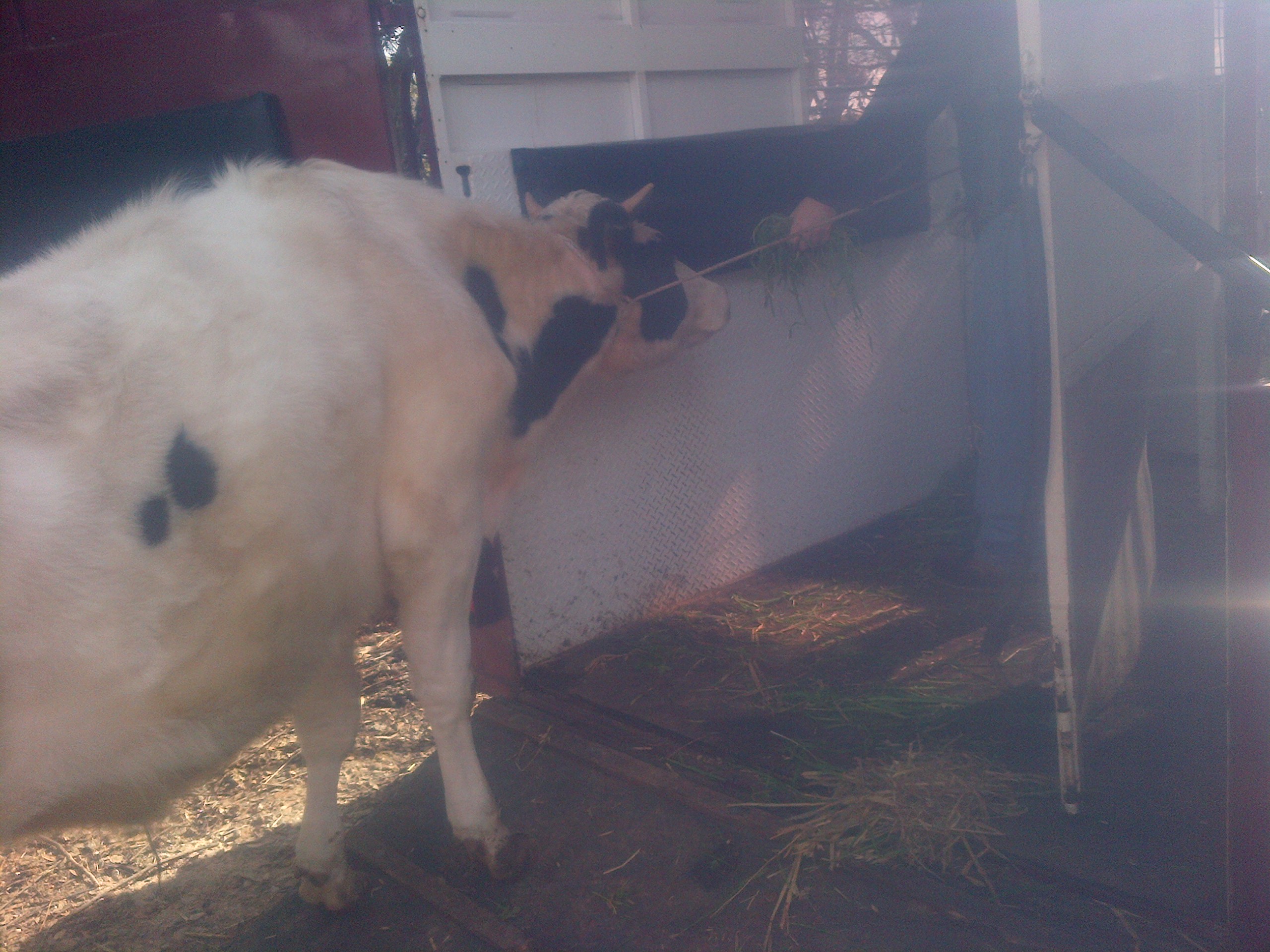 Our stock trailer isn’t suitable for cows, being too low. With that in mind, we hired a horse float, which worked really well. It took maybe 10 minutes to get him in. At first I tried coaxing him in with grass, but that was never going to work. Next I tried coaxing him with grass with a rope around his neck as I pulled him up. That worked a treat.