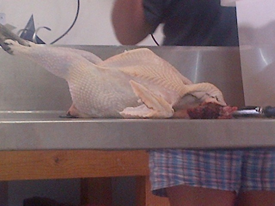 • Today we processed our own birds for the first time. We’ve had something like 60 poultry done, but all professionally. The advantage of doing it ourselves it that every single bit of the bird is used – blood, viscera, feathers on the compost, organs to the dogs, meat in our bellies, bones dried and ground for the garden. The disadvantage is that it’s gross and we’re not very good at it yet. Still, I reckon that with some planning and patience we can become pros.