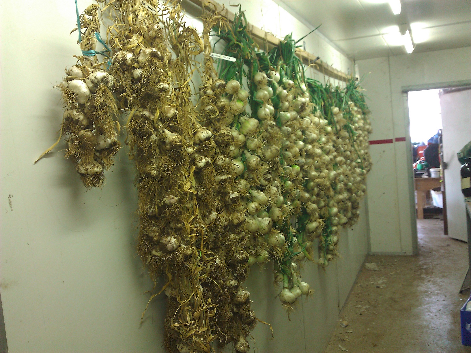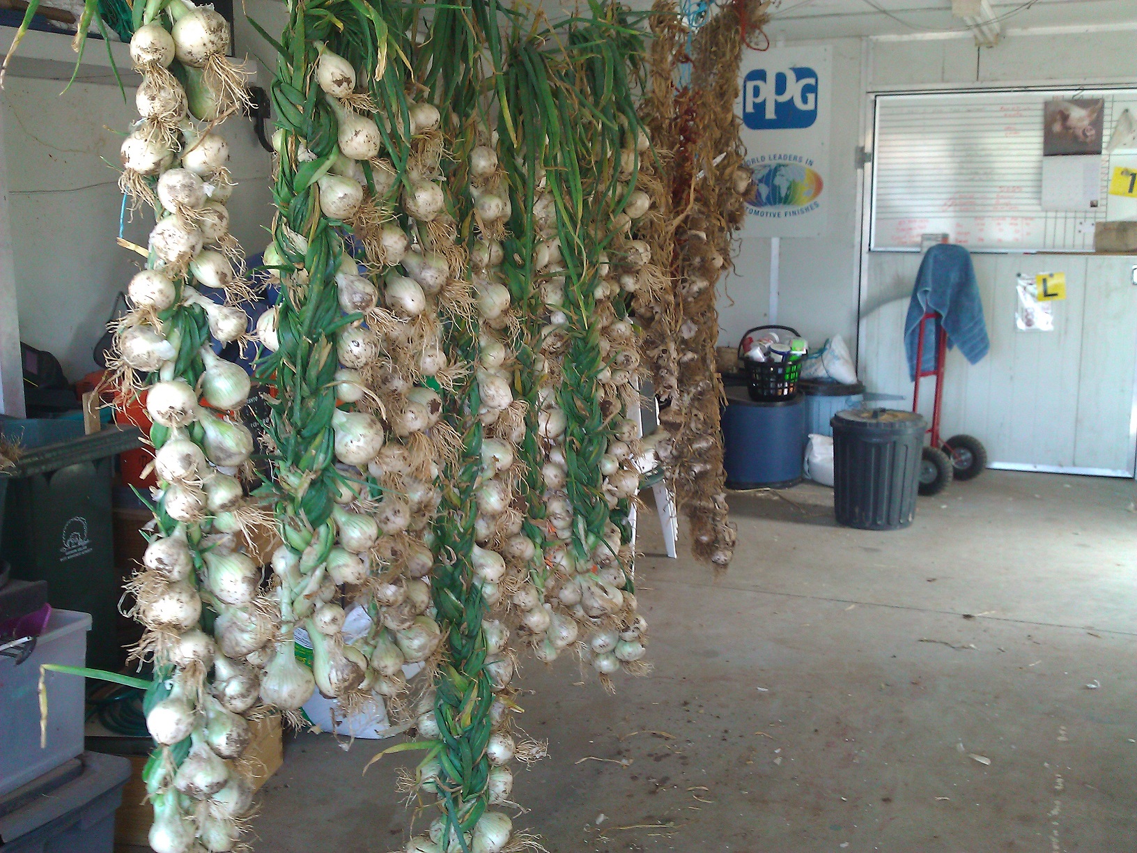 This is the rest of the garlic and most of the rest of the onions hanging in the main part of the big shed. We were running low on hanging room.