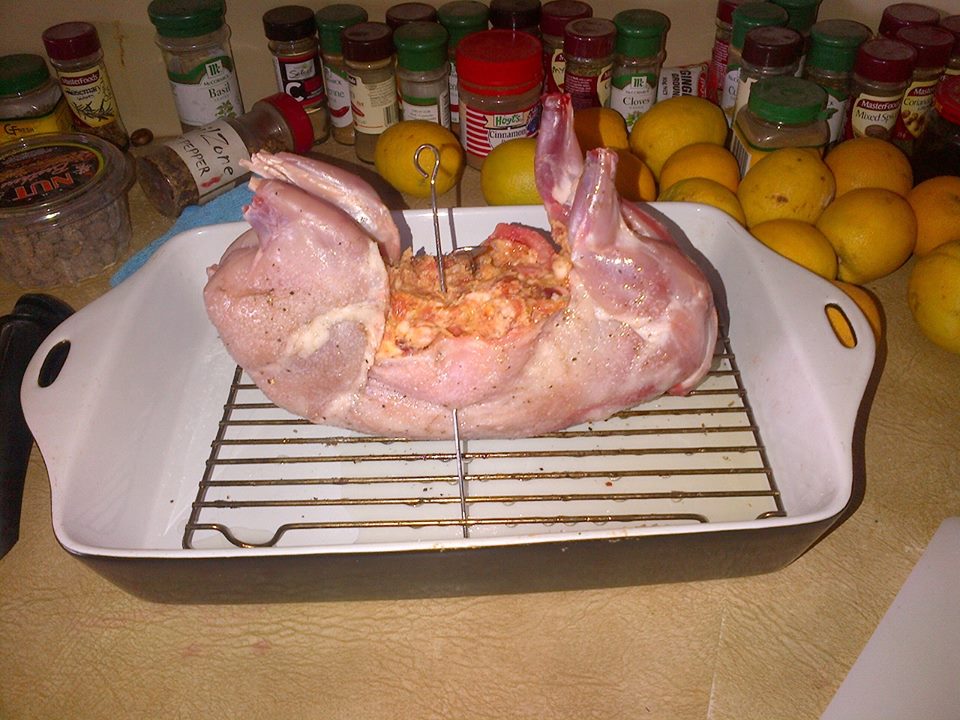 I made up a stuffing using our sausage meat and roasted the rabbit. It turned out surprisingly well.  To me it tasted like strong turkey.