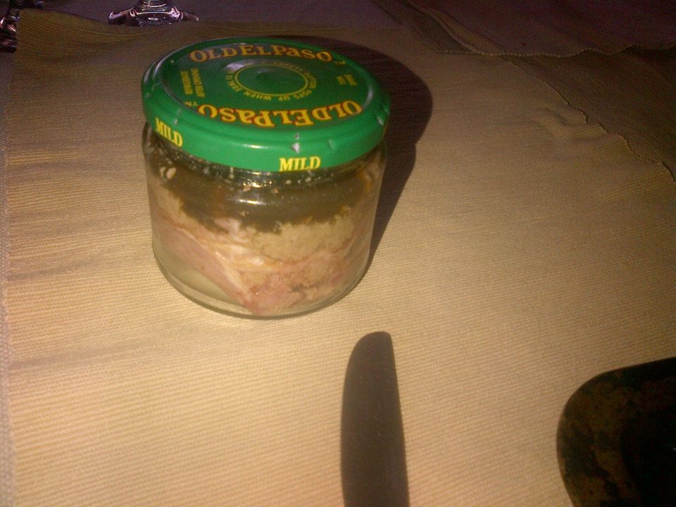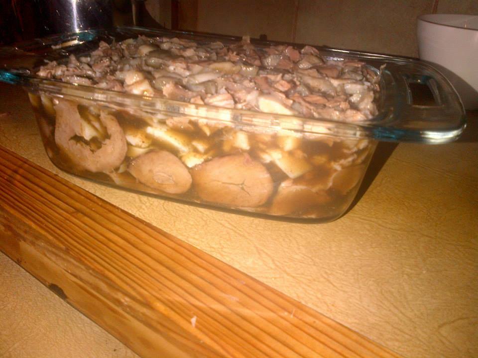 I layered the heart and tongue around the edges, and then put in some of the meat/skin. I then layered the sliced ears in the middle, and topped it off with more meat/skin. The aspic is then poured in to the top. I then covered it, put a weight on top, and put it in the fridge overnight.