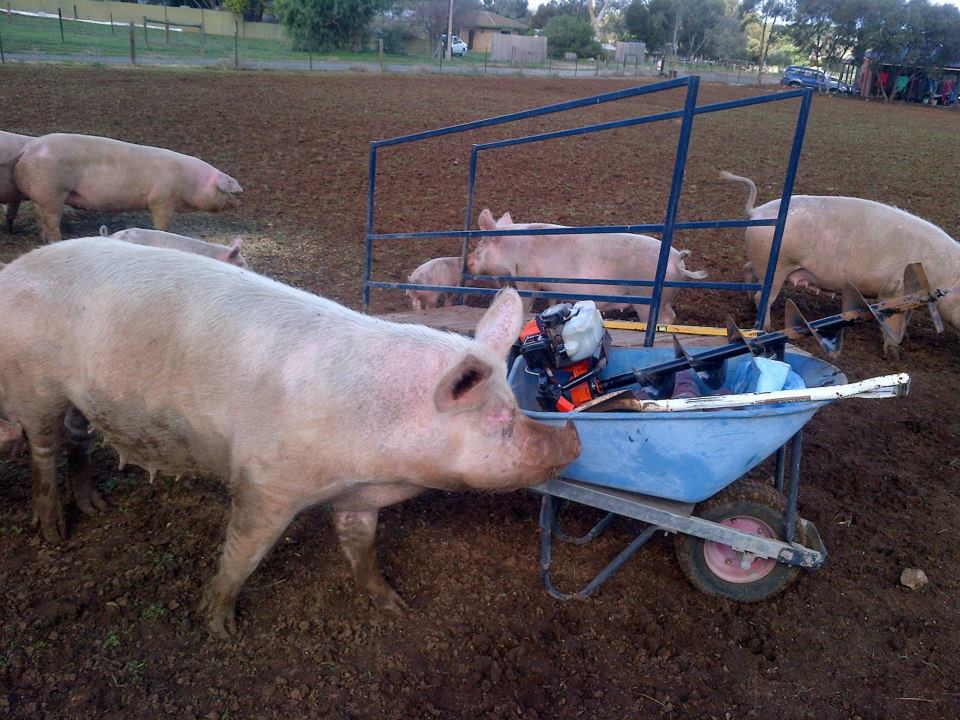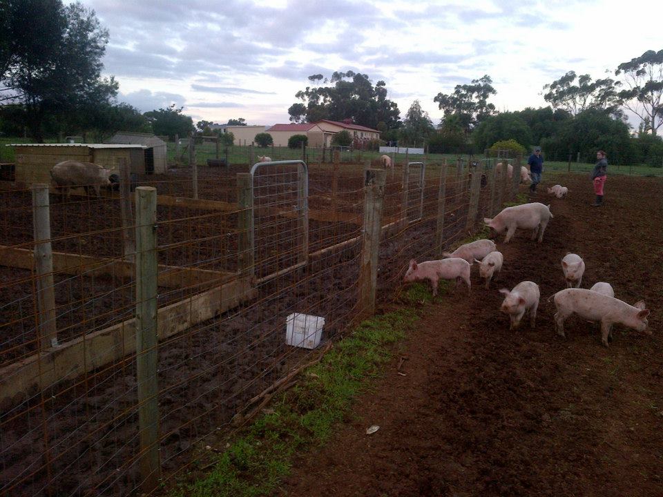 We also fixed up the farrowing shed with some extra lean boards (sleepers aka railway ties) and a modified and permanent creep barrier. We cemented the posts in this time, as the mumma pigs beat the hell out of them by scratching their giant butts against them. For some reason, I took no pictures of that project, which is entirely out of character.