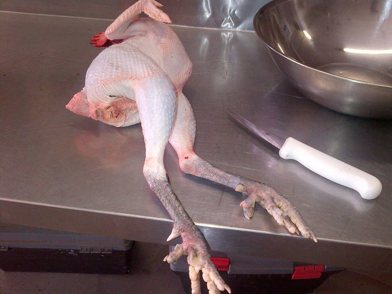 First of all, you take off the feet. That’s fairly easy, as the joint is easy to see and feel. You run your knife around the joint and basically pop the feet off. There’s no need to force the knife through bone or anything hard.