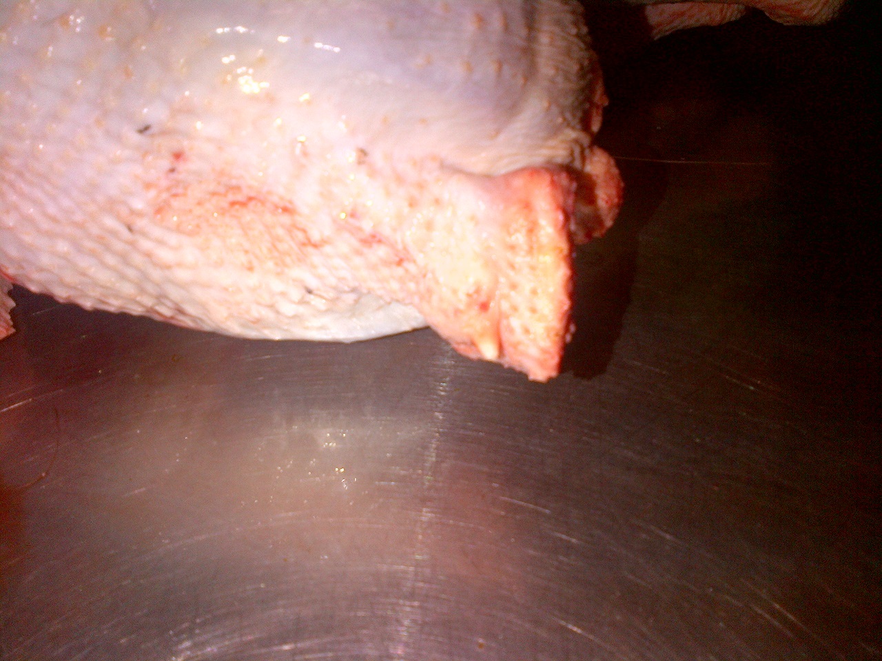 Chooks, like most birds, have an oil gland at the base of their tail, which is called their uropygial gland. That needs to come off. Some people take the tail off completely, but for roasting birds I’d suggest you leave it on. That’s mainly because I love that part (the Parson’s Nose) and so I think you should too. 🙂 Either way, finding the oil gland is easy. It’s right at the base of the tail, is a clear lump, and has a little opening.