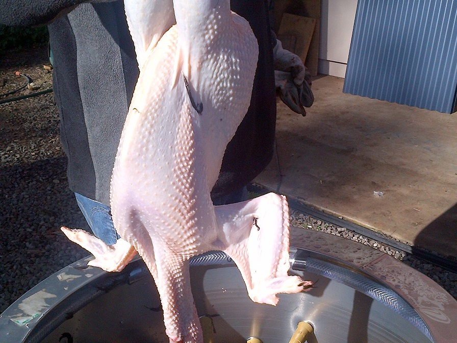 No, no bruising. You’re right – the fact that the animal has been bled means there should be no bruising. I did read one guy say that with the neck breaker he didn’t need to bleed his animals. However, I suspect that he’s either straight-up wrong or at least doesn’t use an automatic plucker. I plan on breaking their necks and then hanging them to bleed.