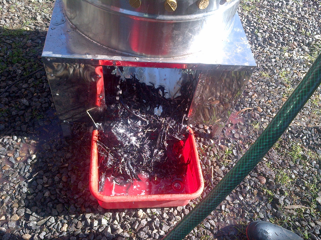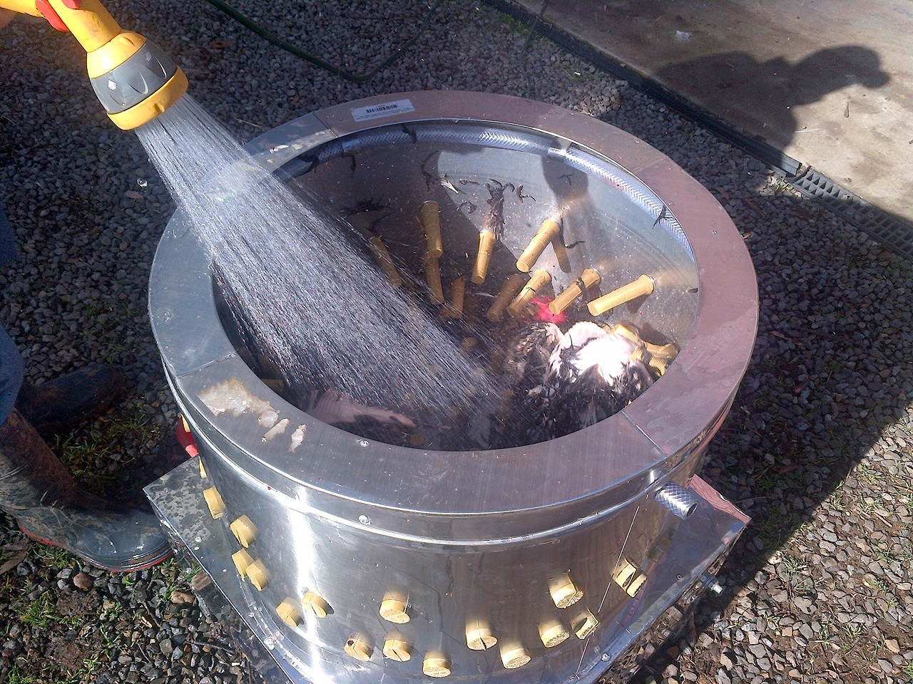 After the first time, we decided to find an automated solution. Linhda found an automatic plucker at an auction in the city, and it’s an amazing machine. It looks like a washing machine full of rubber fingers. It has an attachment for a hose, but it doesn’t output a heap of water. Rather than that, we just used a hose and poured water in.