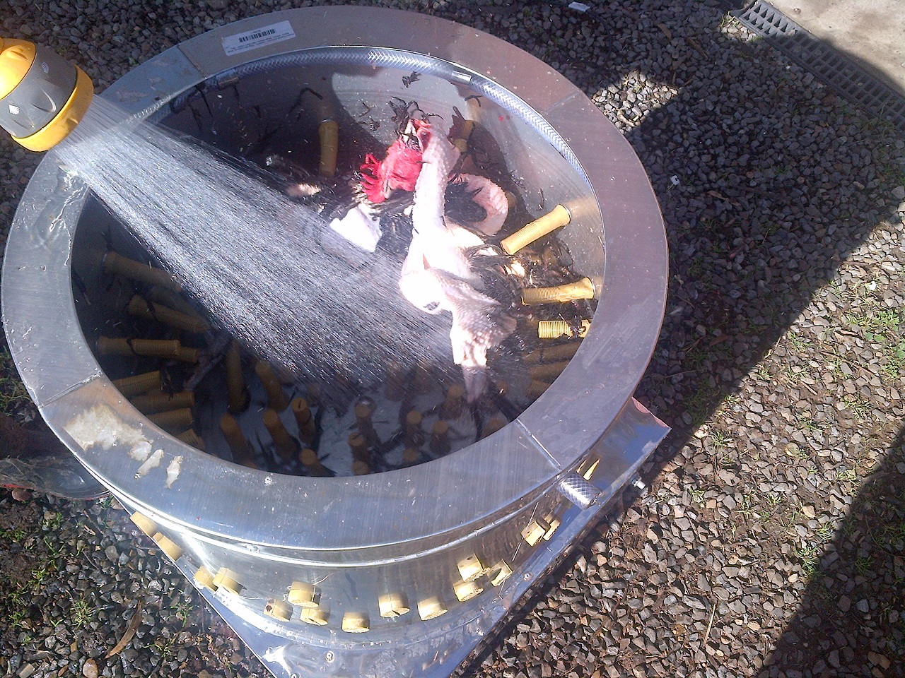 With the plucking machine, you can go from live bird to dressed carcass in maybe 15 minutes. We plan on doing it in a bit of a production line, where we can use the Humane Chicken Killer and hang/bleed maybe 6 at a time, get them in the plucker as we kill/bleed the next 6, and then have a couple of us gutting them. With that working the way I want it to work, we should be able to get a couple of dozen done in a couple of hours.