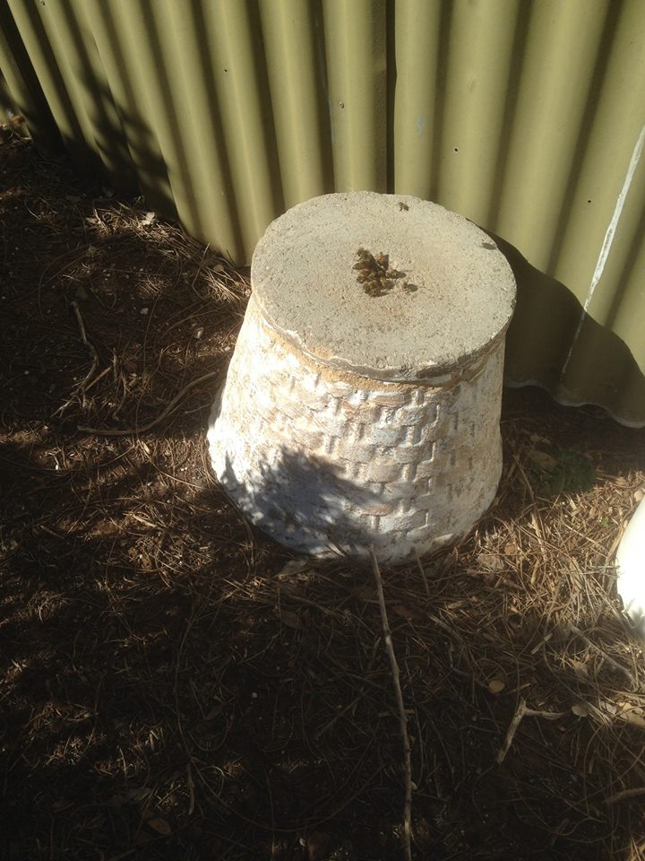 Farmer John found a swarm in an inverted concrete planter. Dad and I came up with a way to catch it by rigging a super on top of the planter so the bees are forced to enter and exit through it. The theory has worked well so far, and now we’re trying to work out how to move them out of the planter…
