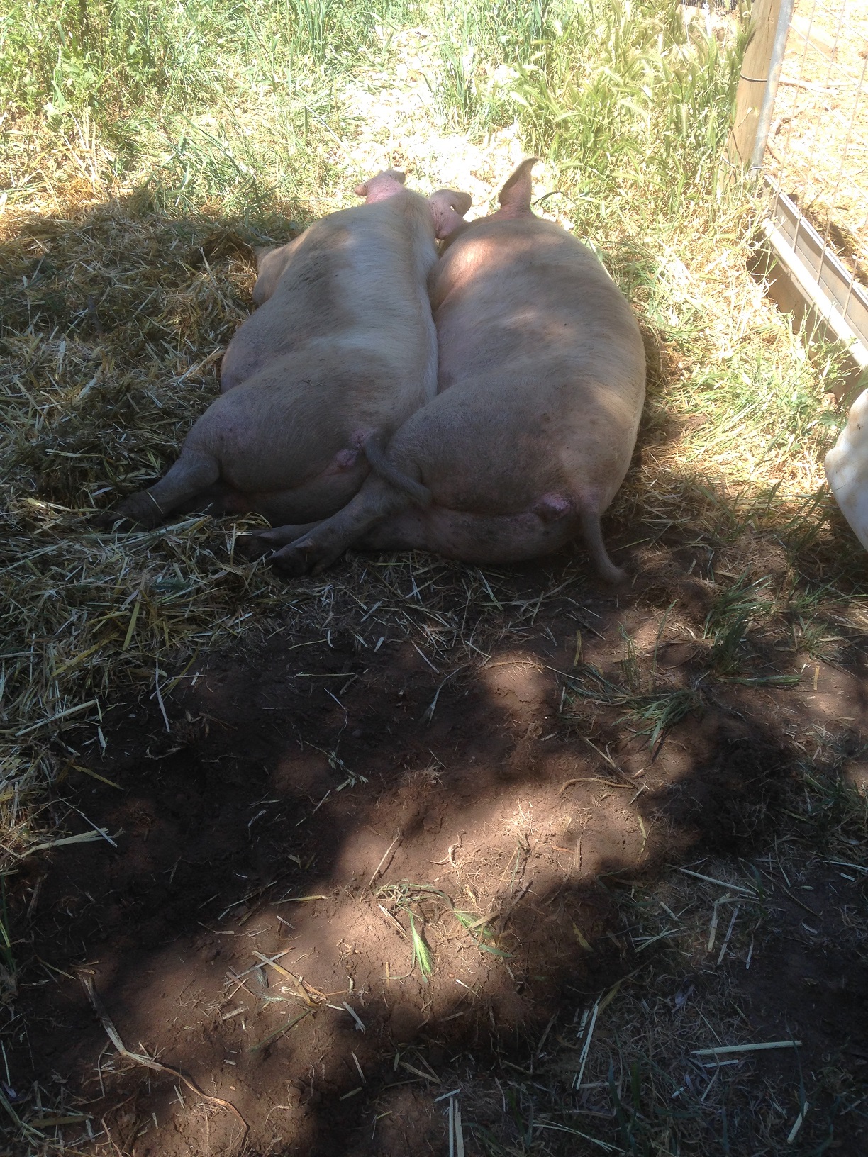 Two of our sows spooning after spending the day eating their way through my veggie patch.