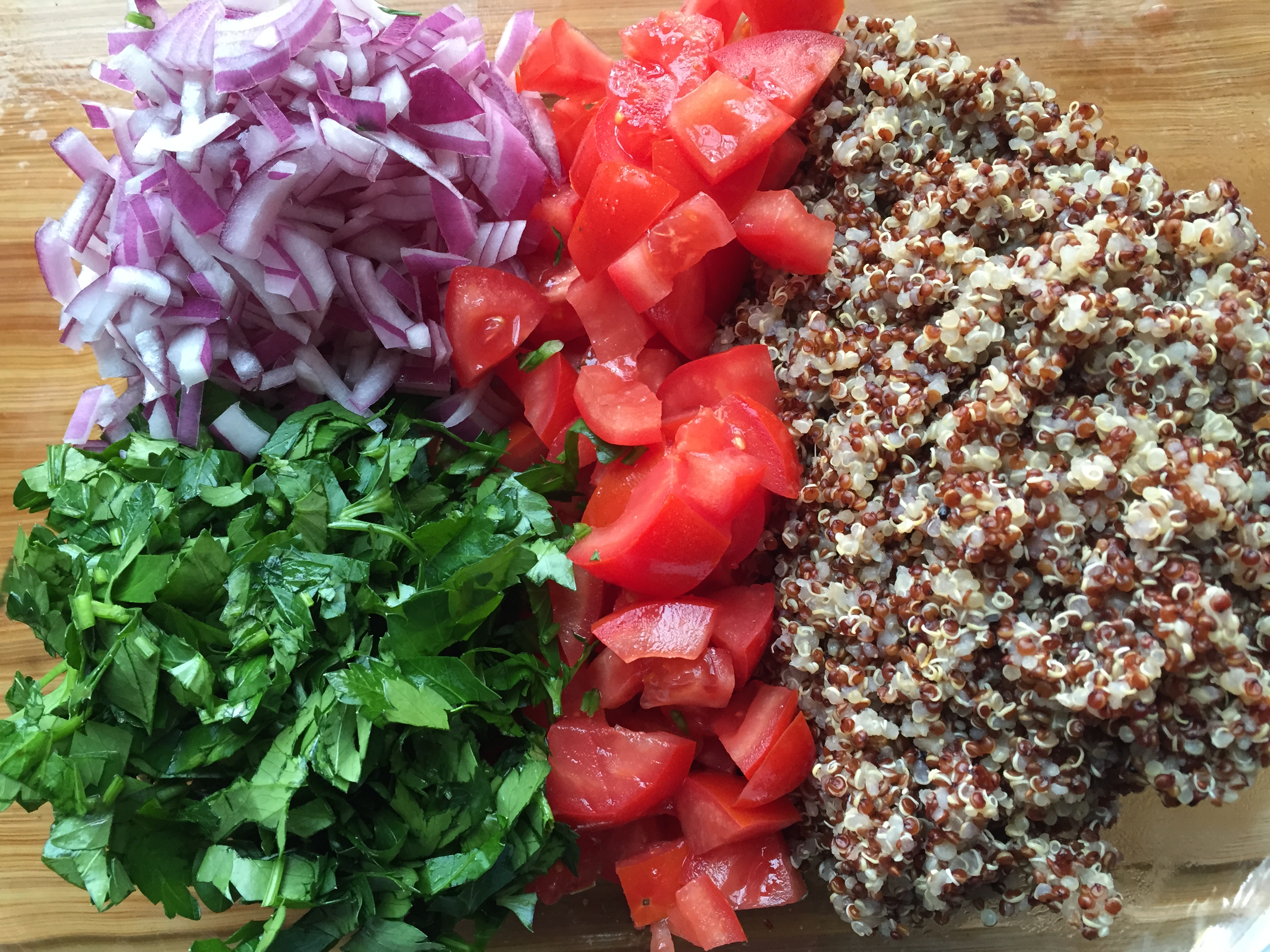 I have never been a fan of tabouli and I think it’s because the ones I’ve eaten have too much parsley, so while I’m calling this tabouli others might think of it as quinoa salad. Also, I don’t think I’ve ever seen burghul in the supermarket and that’s why I use the quinoa. I prefer the flat leaf parsley for no other reason that I like how it looks over the curly leaf parsley. Also a cup of quinoa makes a lot of cooked quinoa, I learnt that lesson the hard way the first time, and we were eating it for days! Making this a day before serving is fine.