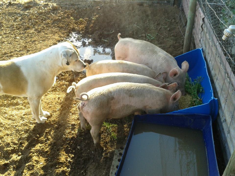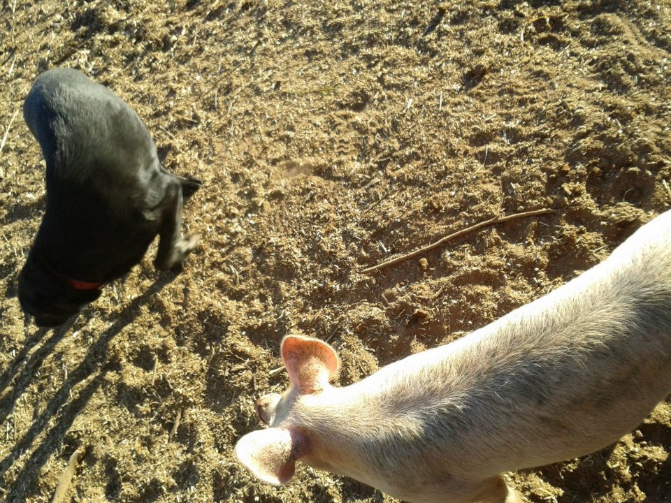 Bruce loves the pigs, but was not at al comfortable with this level of intimacy.