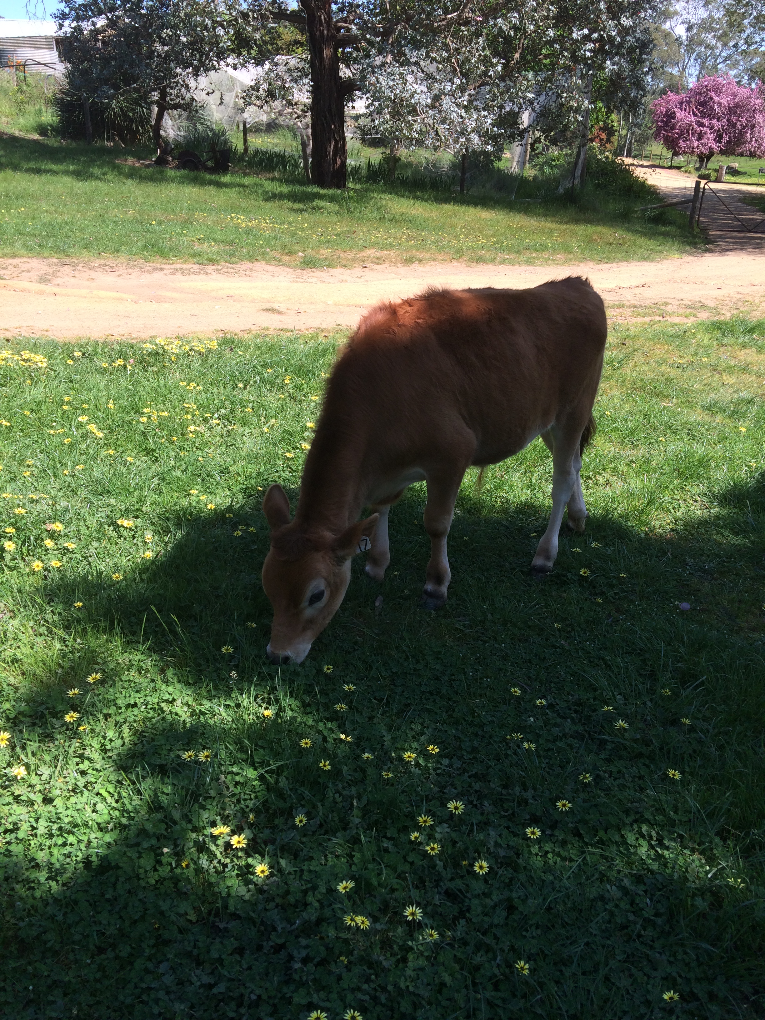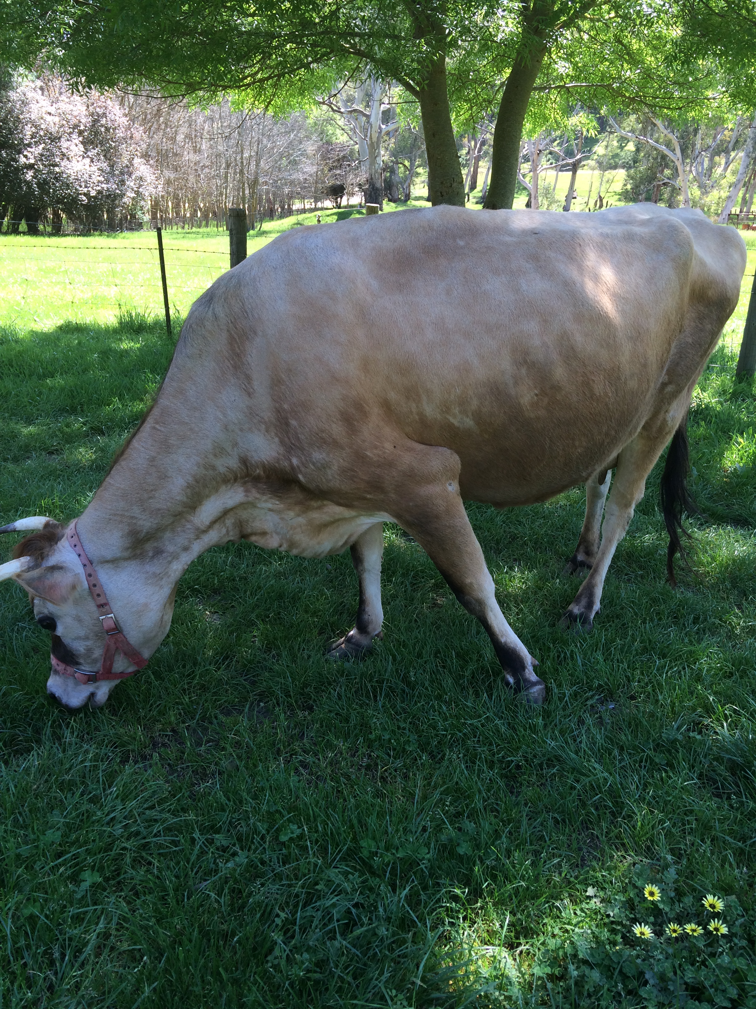 We said goodbye to our Jersey house cow, Clarisse, in October. 😦  We’d had her for more than two years, and struggled our way up the super steep learning curve that is keeping your own house cow.  It worked though!  We had to take her back to get her pregnant; we built her a milking shed; she lost her baby so we went and got her two to foster; her and I learned together how this whole milking things works; we made cheese from her milk and seriously the best coffee you’ve ever tasted! We even had a small mastitis scare, and I had to give her a course of antibiotics, involving a week of injections in the butt! (her butt, just to be clear)