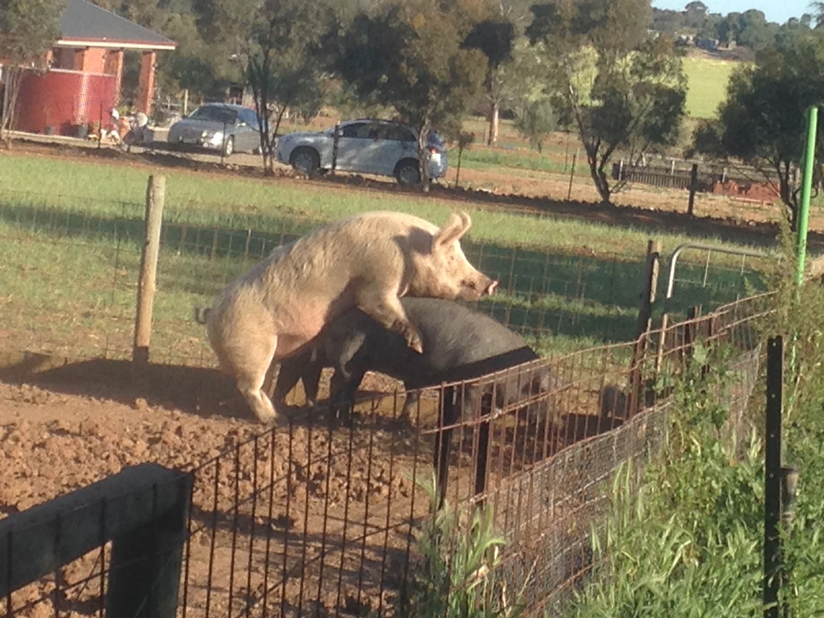 We thought the girls were in season when we decided to put them all in together. We’re getting pretty good at picking that, though to be honest the sows are none-too-subtle about it. We saw them couple pretty much right away, as evidenced by the picture above. We saw Boris couple with both girls and so figured they’d both be pregnant at the same time and drop around the same time. We want to farrow the girls in pairs. We’ve tried farrowing them truly together with some fairly disastrous results. Our plan now is to have them drop in pairs, keep the mums separate for a week or two, and then have them all in together. This will help us foster babies if we need to, and the mums just like to have company.