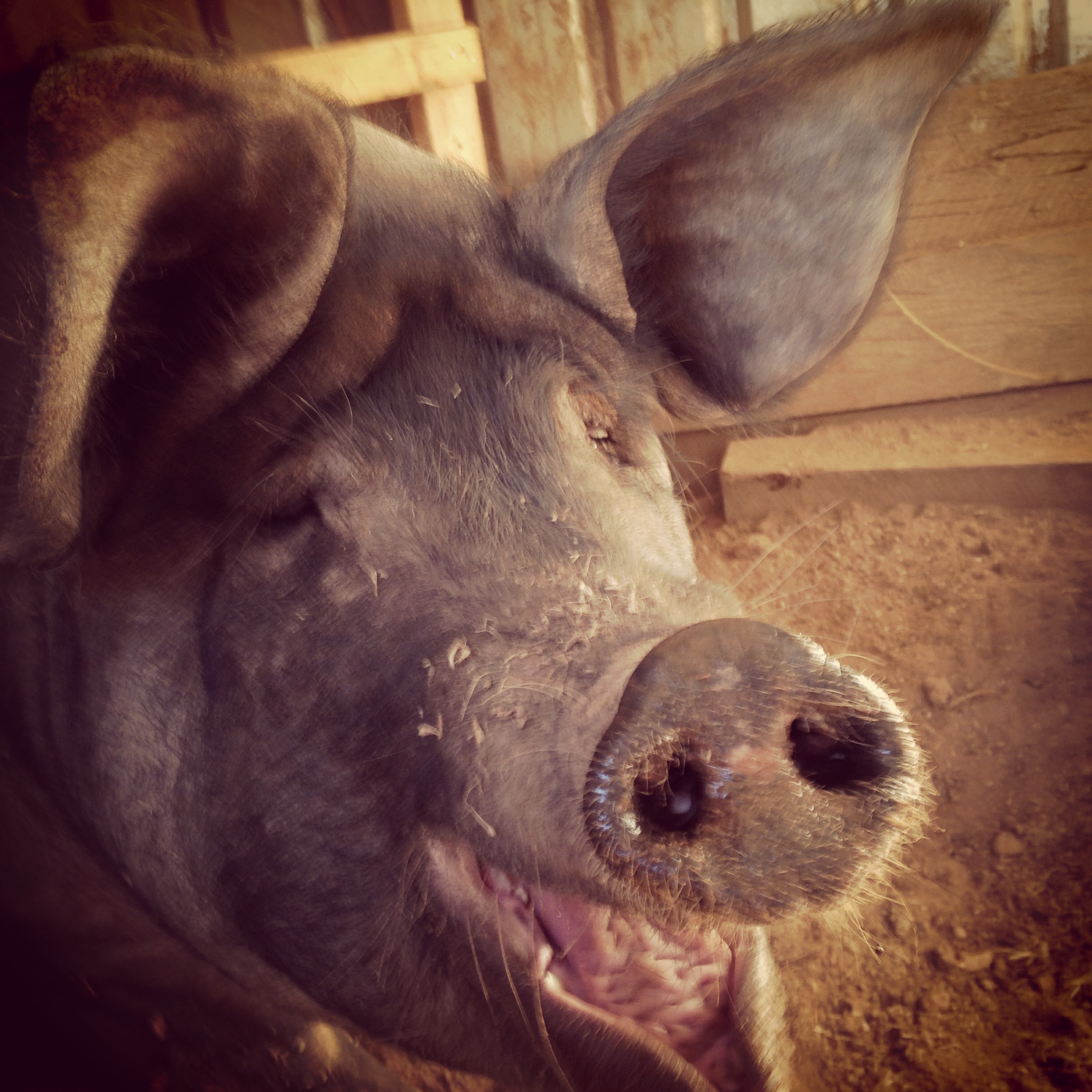 The father of these piglets was pure Large Black and the mum was pure Berkshire. They were both huge, and both just lovely, friendly pigs. The weird thing is that the two girls, despite being litter-mates, look like different breeds. Miss Swan looks like a Large Black, not surprisingly being giant and entirely black, while Socks looks like a Berkshire, being smaller and having a white star/blaze and 4 white feet. It’s fascinating thinking about how they came from the same litter, and yet identify genetically with different parents.