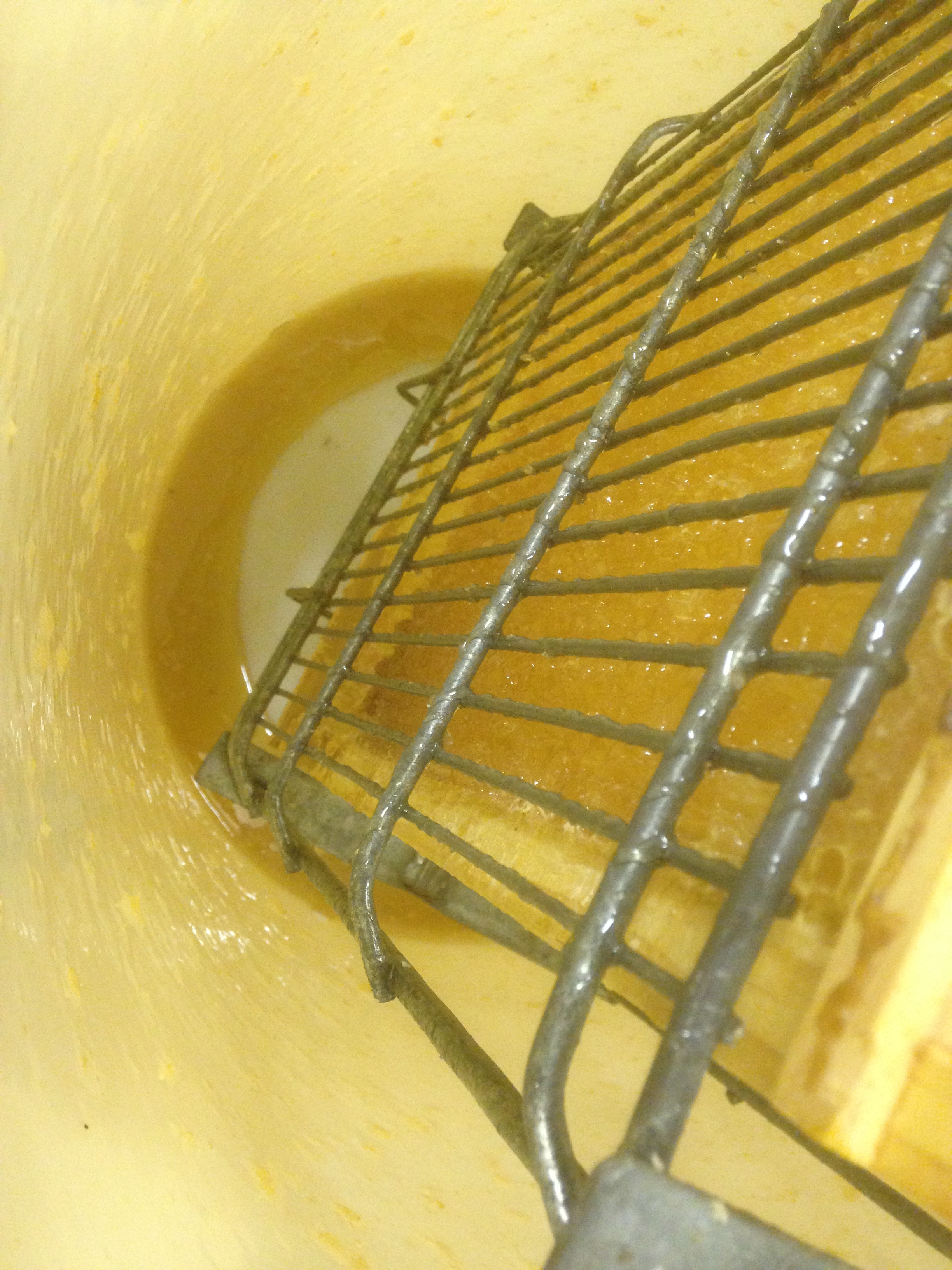 The extractor set up to flow into our honey bucket. Linhda did make me filter it through a colander with cloth over it. She apparently doesn’t like bee bits in her honey.