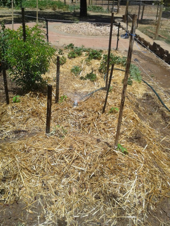 We managed to get some pea straw from Farmer John to use as mulch. We’ve seen quite a bit of pea straw around lately (it’s that time of year), and much of it looks super dodgy, being badly tied in loose bails. These bails, which cost us only $20 each, are tightly bound and just gorgeous!