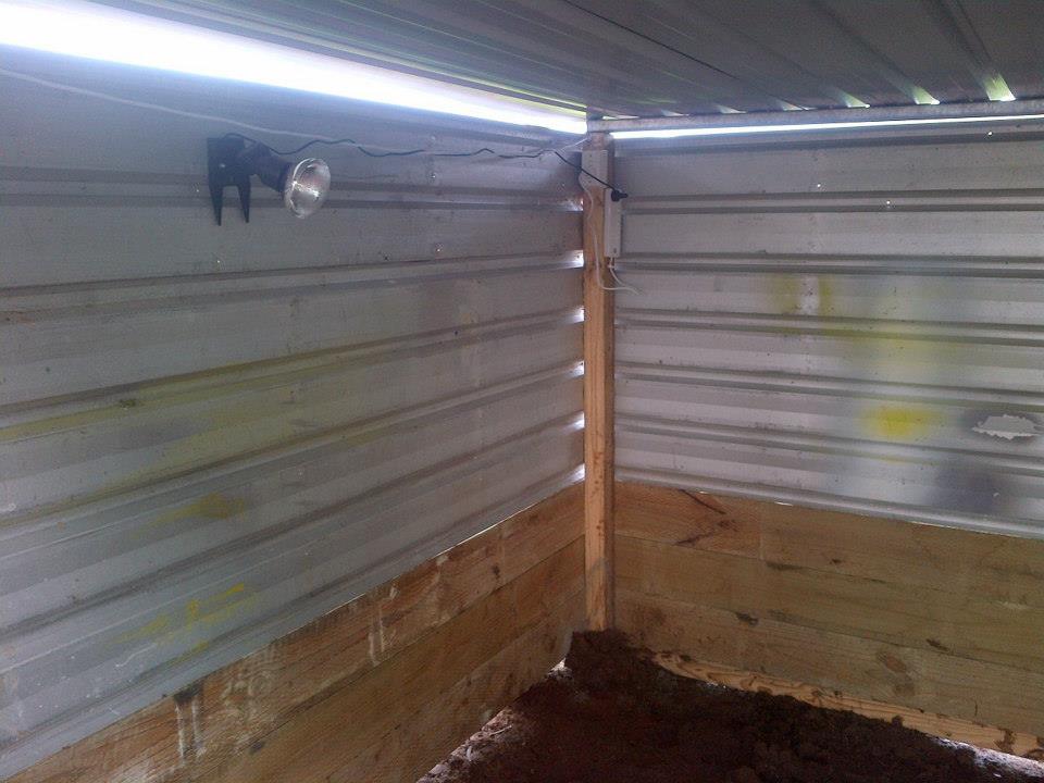 Lastly, we ran power over from the other farrowing shed and put a power strip in. This shed will have two heat lamps and a flood light, so the power strip seemed a good idea.