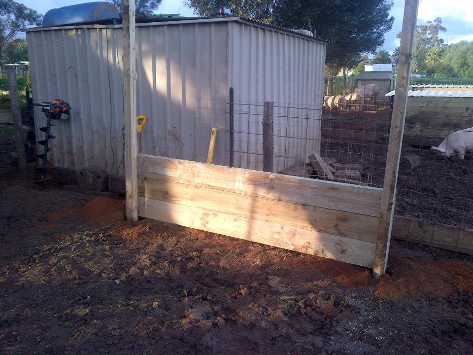 In April we made some pig shelters using sleepers. This allowed us to make them super-solid and rugged. They can stand up to even a 300kg pig rubbing its fat arse for all it’s worth, and in fact won’t even budge. At the same time, our farrowing shed, a 3m x 3m garden shed, is a little flimsy for pigs. We have sleeper lean boards up, and have reinforced it, but they still beat the hell out of it. Now that we want to expand our operations and farrow our girls in pairs, we’ll need a larger and sturdier shed. We decided to expand the design of our shelters and use it for the new farrowing shed.